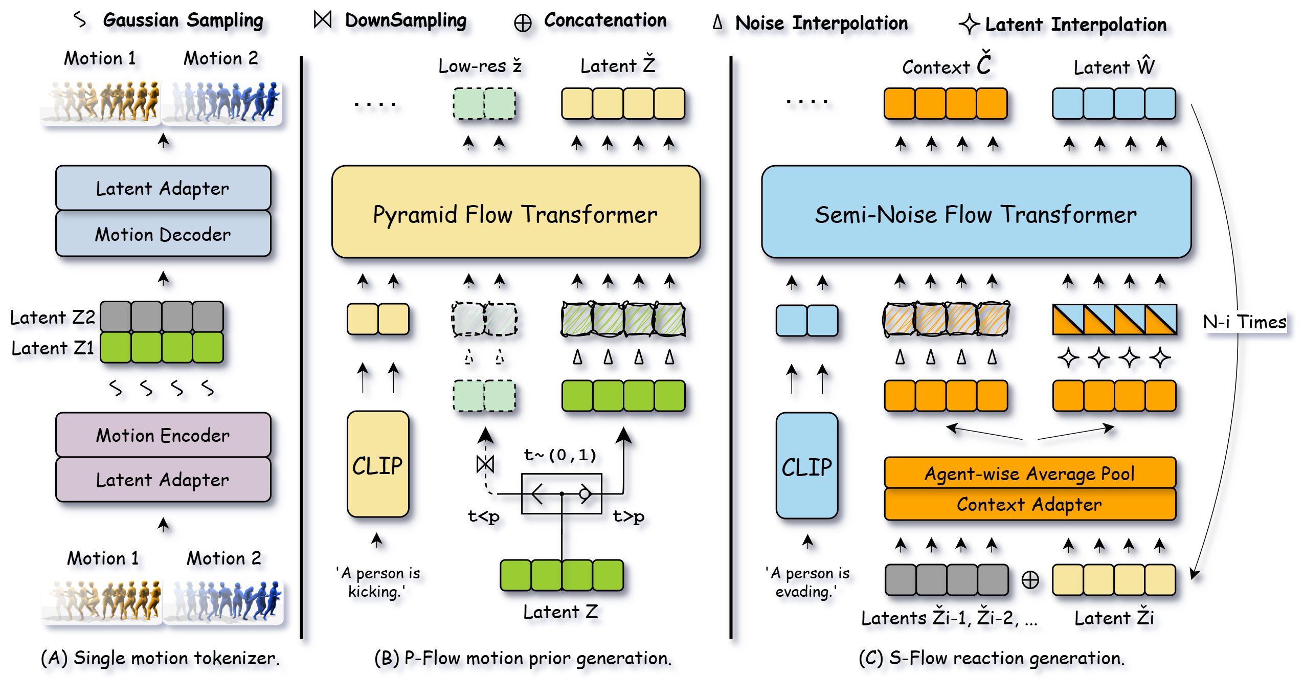Figure 2. Overview of the UMF architecture. (A) Unified Motion VAE: Encodes heterogeneous motions (HumanML3D, InterHuman) into a regularized multi-token latent space, bridging domain gaps between datasets. (B) P-Flow: Synthesizes the individual motion prior hierarchically — processing low-resolution latents at early timesteps and full-resolution at later timesteps, reducing computation by ≈1/K. (C) S-Flow: Generates reactions by jointly learning context reconstruction and reaction transformation paths, alleviating error accumulation. Applied autoregressively for N > 2 agents.